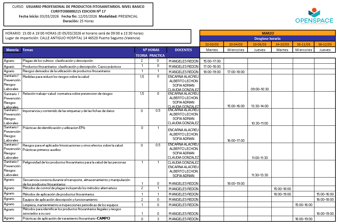 Durante el curso se trabaja la identificación y clasificación de plagas y productos fitosanitarios, la interpretación de etiquetas y fichas de datos de seguridad, el uso correcto de EPIs y equipos de aplicación, buenas prácticas de almacenamiento, transporte y manipulación, la gestión de residuos y envases, así como la prevención de riesgos laborales y la protección del medio ambiente.